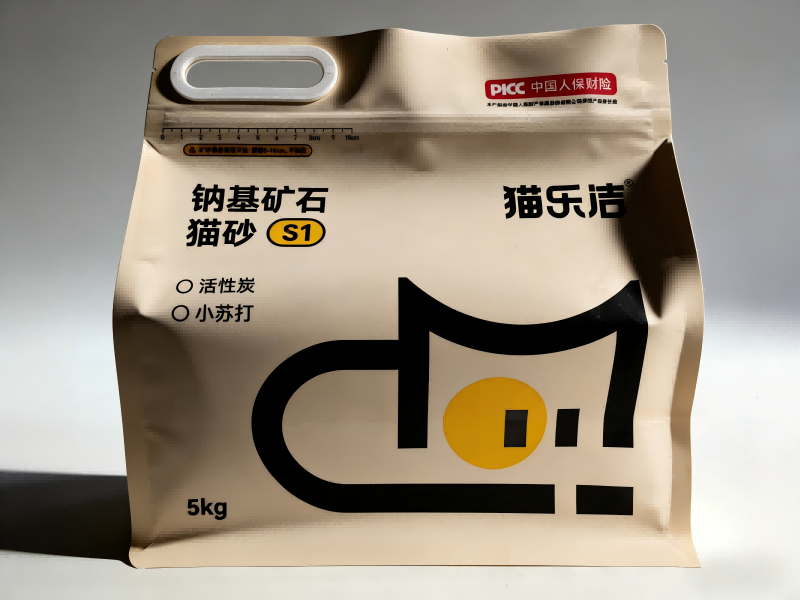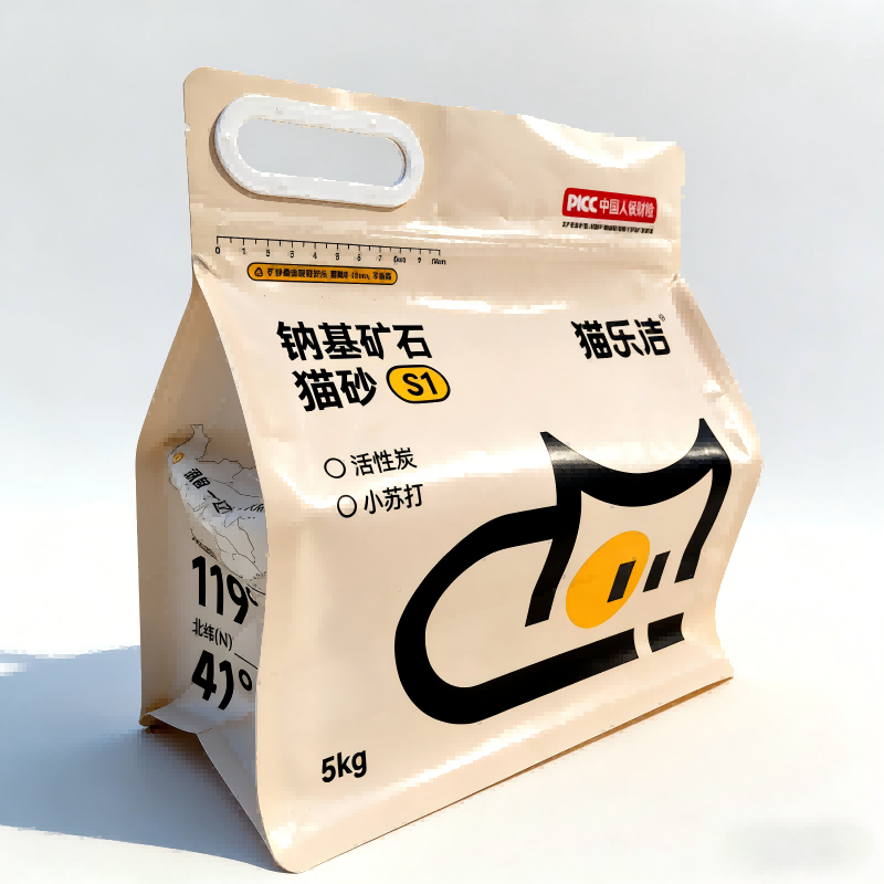 De achtzijdige afdichtingsstructuur houdt de tas stabiel en rechtop, ideaal voor prominente schapdisplays. Het vergemakkelijkt ook stabiel stapelen en gemakkelijke opslag. De ritssluiting zorgt voor een veilige en betrouwbare afdichting en voorkomt dat vocht en stof binnendringen, zelfs bij herhaaldelijk openen en sluiten. Bovendien zorgt het ontwerp van de versterkte kunststof handgreep ervoor dat 5 kg kattenbakvulling gemakkelijk kan worden gehanteerd, wat de gebruikerservaring verbetert.